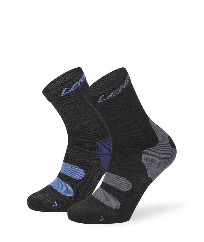 We use a mix of synthetic and natural fibers for our hiking socks. The combination of these materials offers optimal fit, breathability and moisture management for hikes. Lenz products with Merino SoftTec® , such as the Trekking 8.0 or Trekking 8.1 , also have a special inner layer made of high-tech yarns - for completely scratch-free comfort and long durability. Merino wool is known for its excellent moisture wicking - this ensures a pleasant foot climate and keeps feet dry. Polyamide and elastane are particularly hard-wearing and give the socks their elasticity. Hiking socks should never be made of pure cotton. Although cotton can absorb liquids well, unfortunately cotton is very slow to dry.