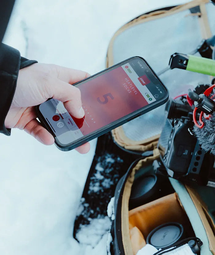 La manchette confort avec boutons pression fixe le pack lithium. Celui-ci peut être acheté en option avec les chaussettes chauffantes. Il se commande soit en appuyant sur un bouton du pack lithium, soit avec l'application gratuite pour smartphone.