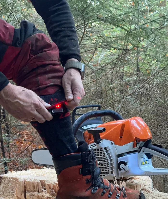Le pack de lithium rechargeable peut être fixé à la ceinture de la chaussette à l'aide de boutons-pression. Les chaussettes chauffantes sont compatibles avec tous les packs de lithium du système Lenz Body Heat.